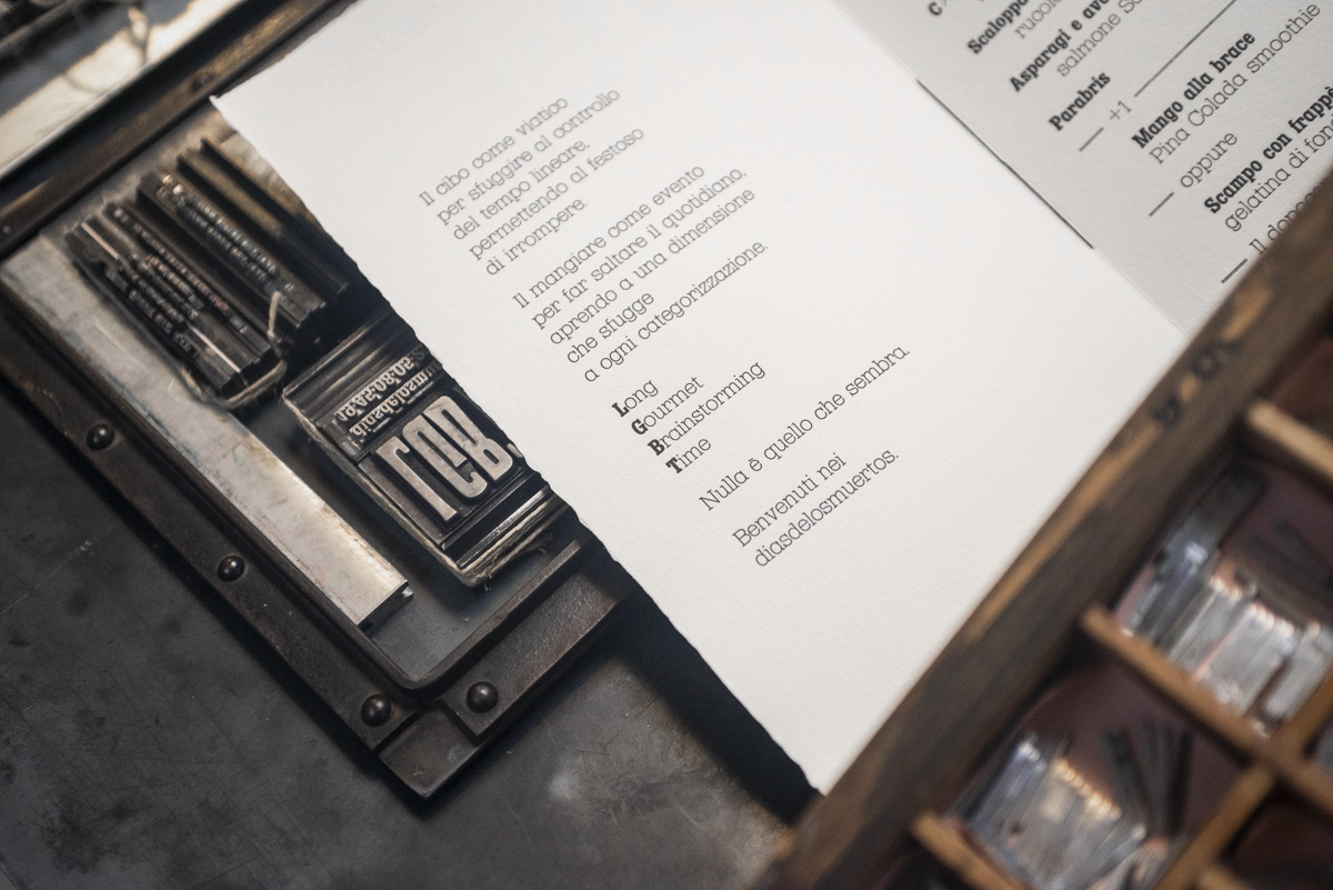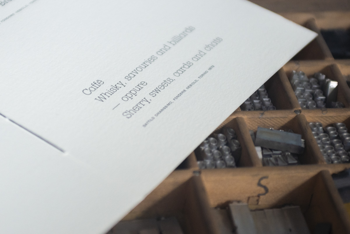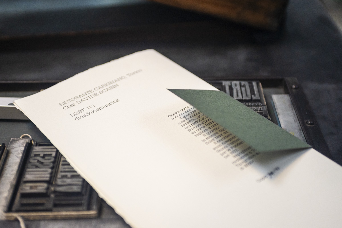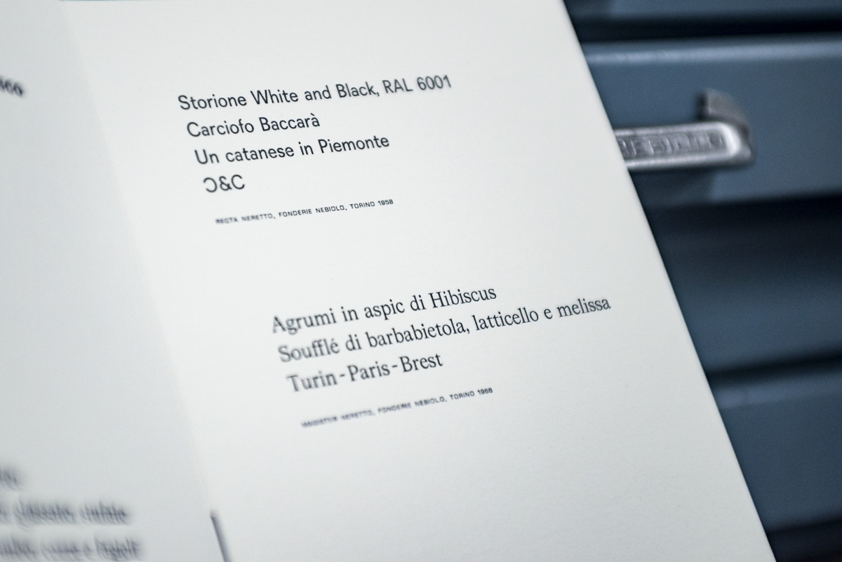 Since 2024, Archivio Tipografico has been responsible for producing the menus for Chef Scabin at Ristorante Carignano, under the artistic direction of BRH+. The menus are designed to incorporate visual elements and conventions from the world of art printing, shaping the experience of a dinner meticulously crafted by a Michelin-starred chef. The menu sheets are hand-composed with lead and wood type, printed on pure cotton paper, and numbered by hand.