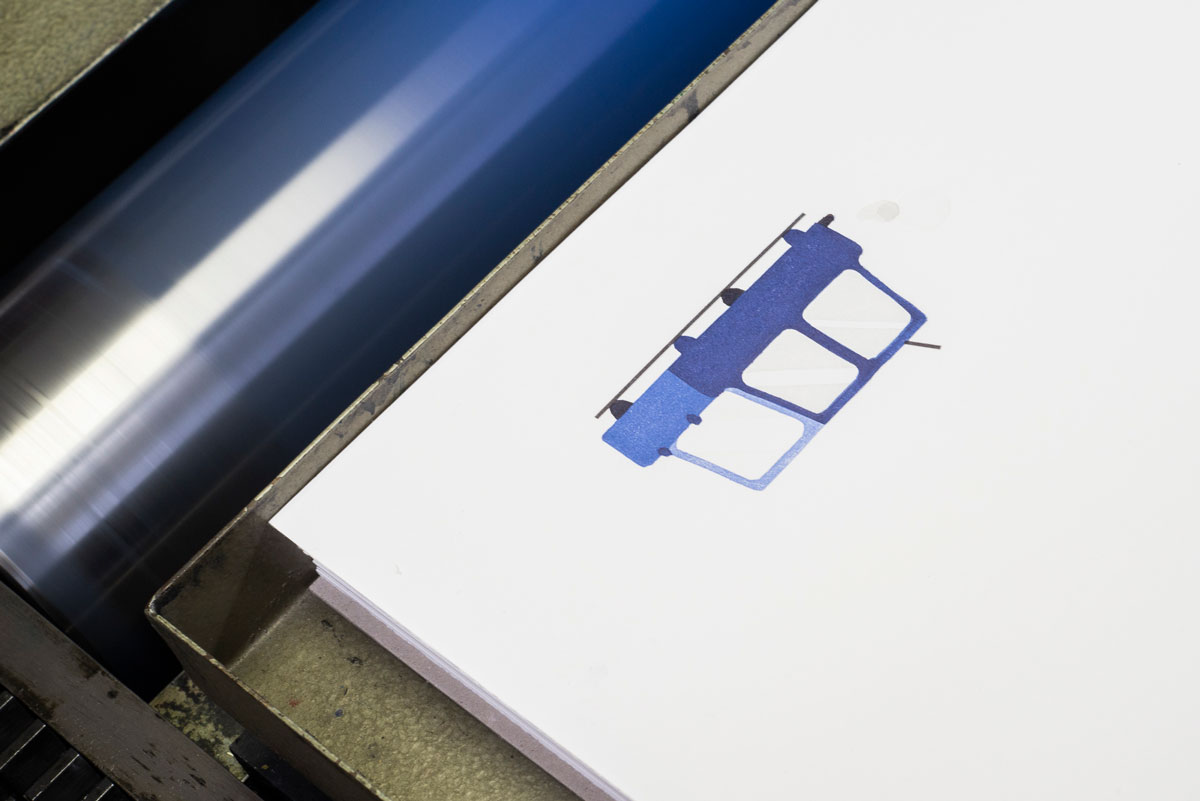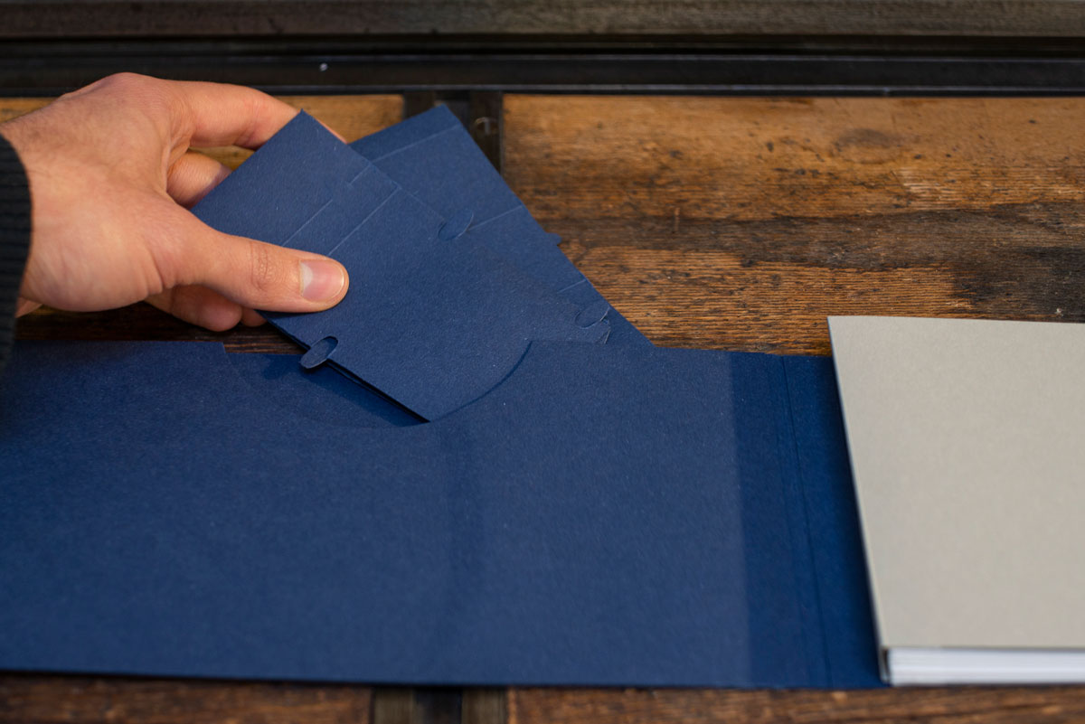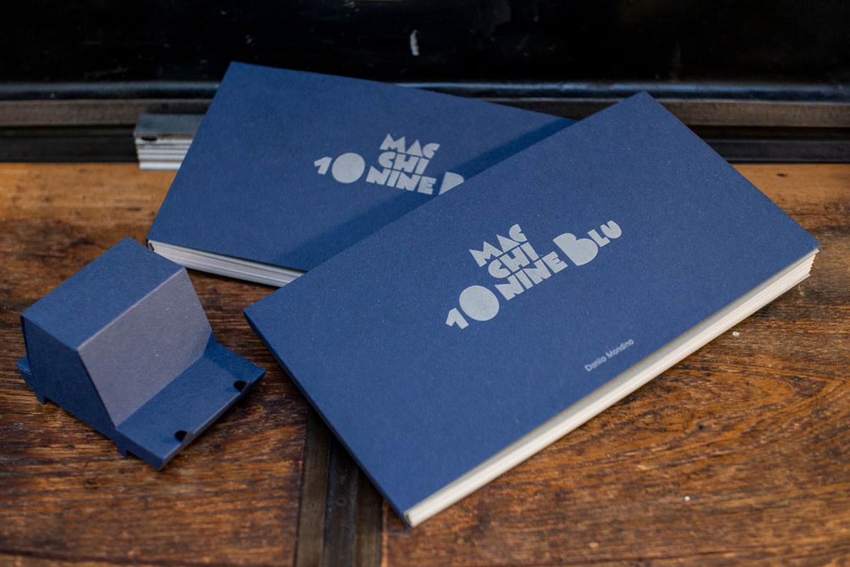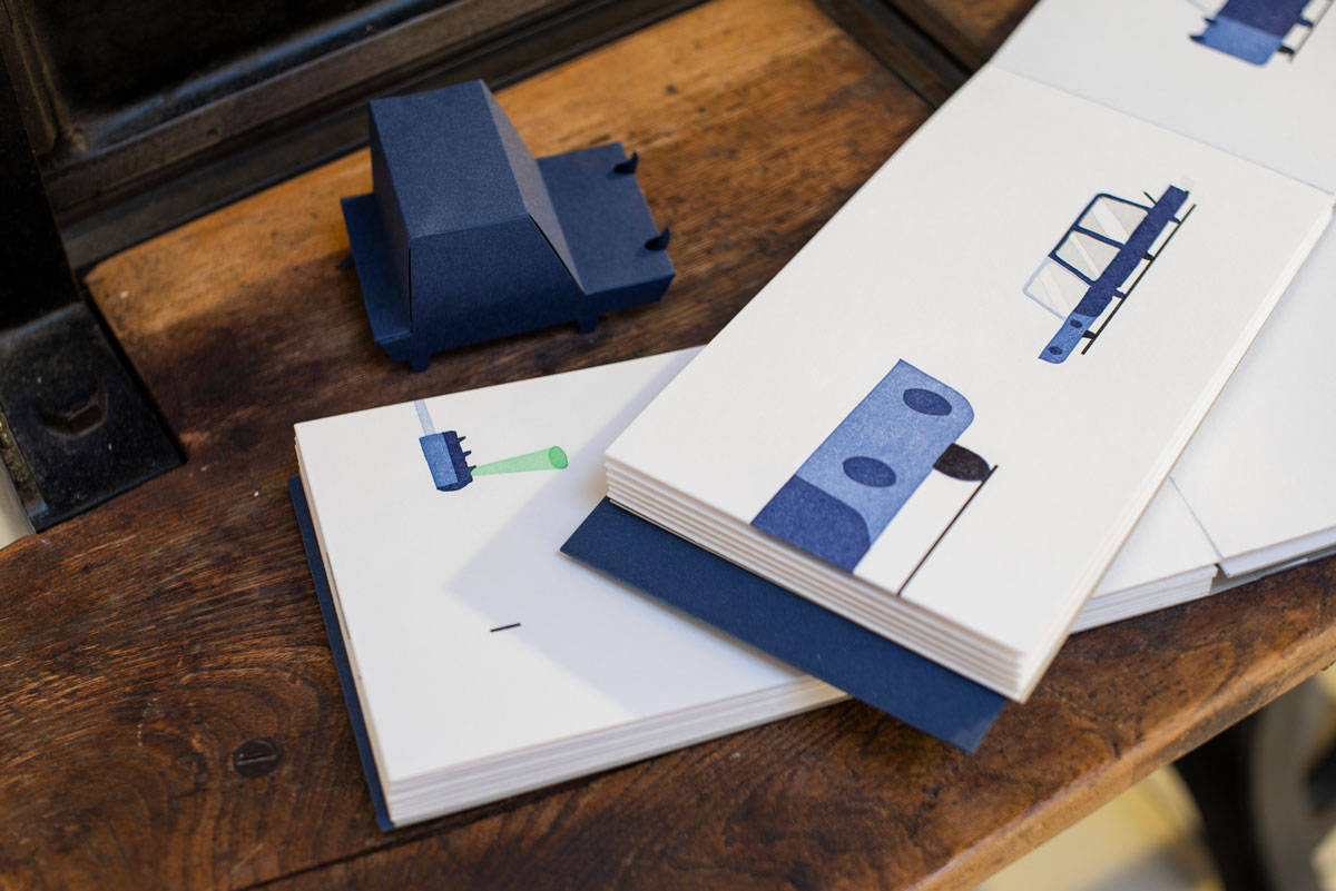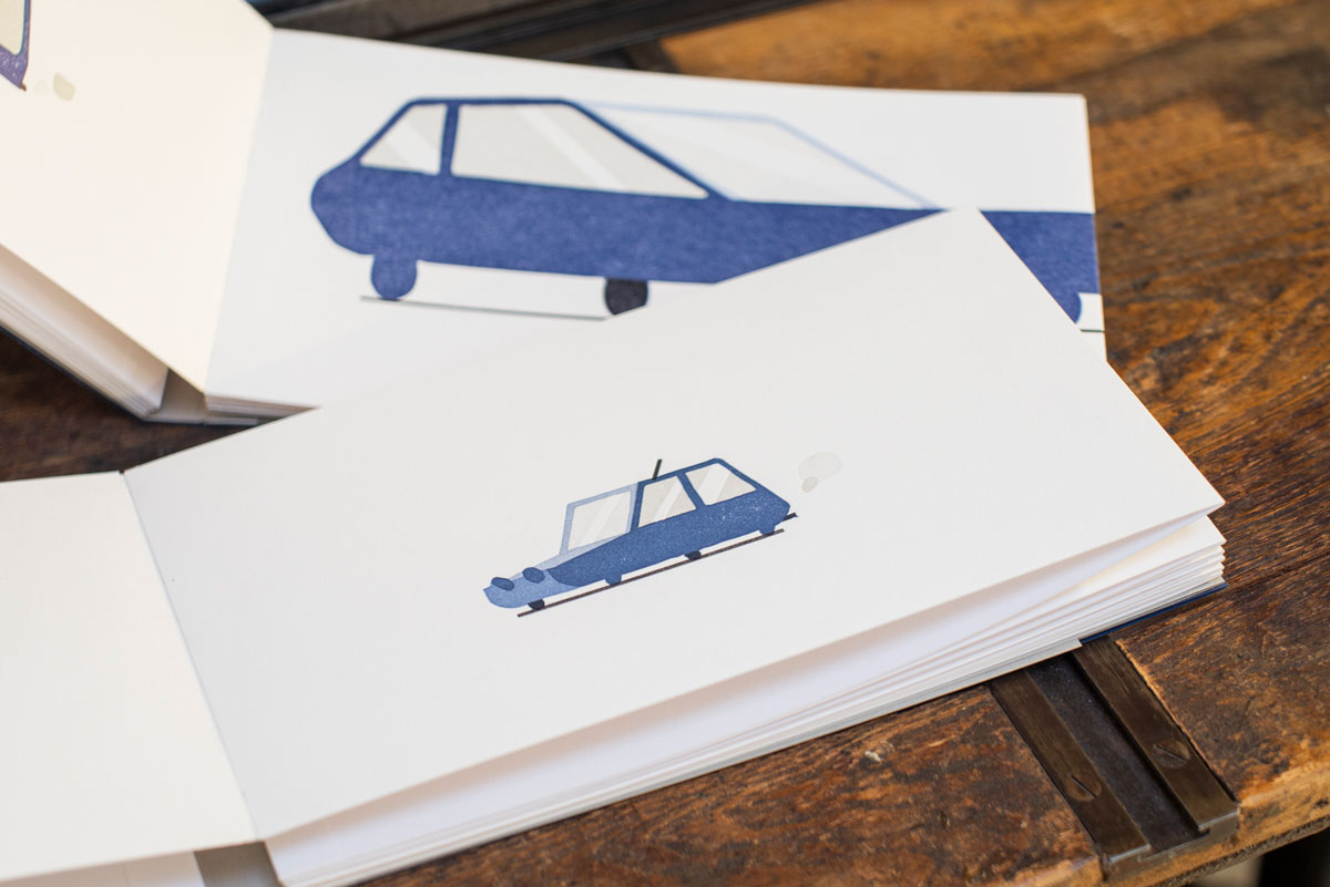 Un silent book legato a mano a leporello, risultato di sperimentazioni su tirabozze con la tecnica delle matrici a perdere, utilizzando matrici in linoleum e sovrapposizioni consecutive di colori, per un totale di 7 tonalità di blu per ogni illustrazione.
