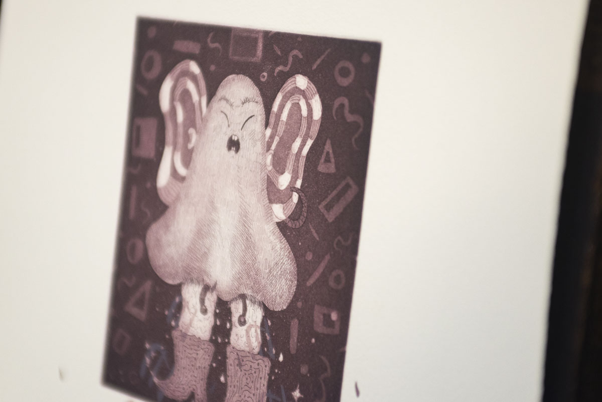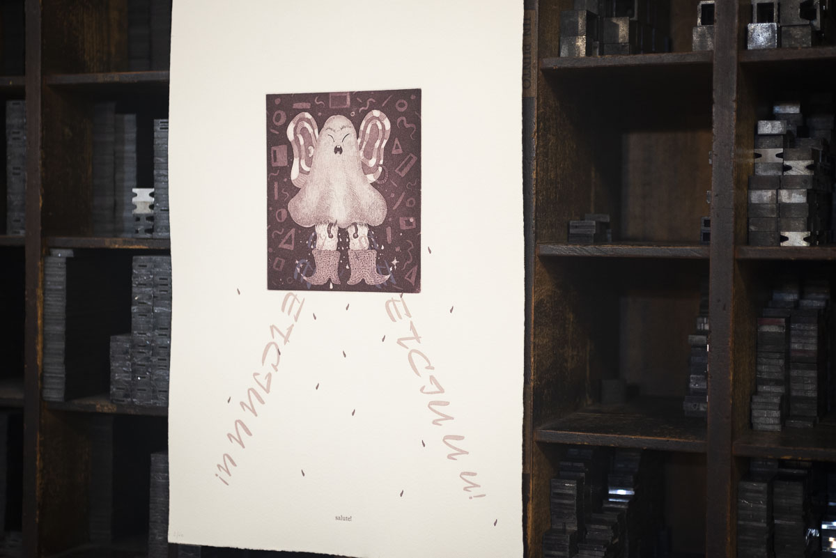 L'illustrazione, realizzata con la tecnica dell'incisione, cattura ogni dettaglio, mentre il testo “Etciù!” con i suoi accenti e apostrofi sono stati stampati con caratteri mobili, mantenendo la stessa palette di colori per un risultato coerente e vivace.