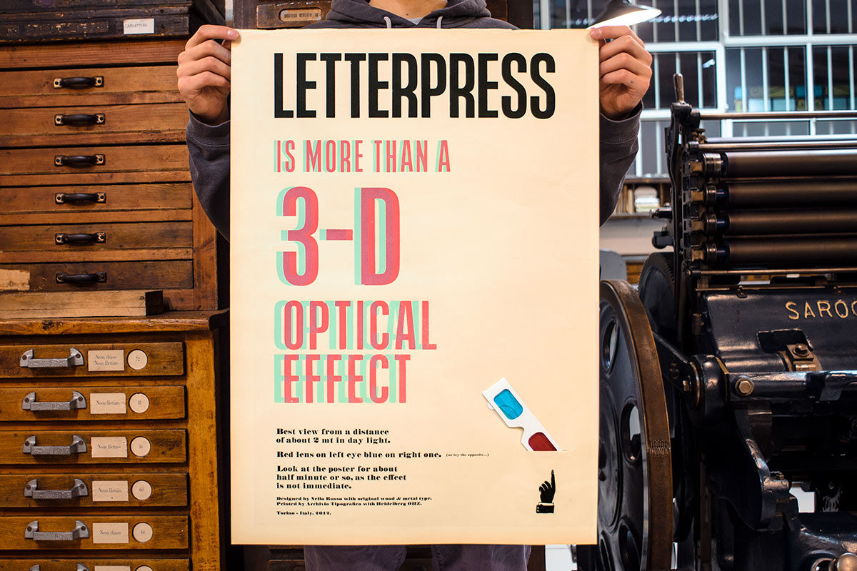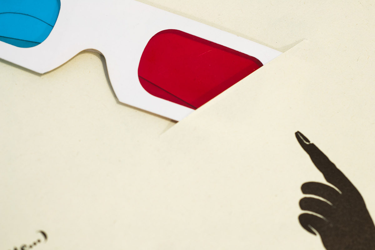 Un poster anàglifo con una piccola tasca di carta per un paio di occhiali 3D (inclusi). Risultato di una riflessione su ciò che per noi è la stampa tipografica. Una tecnologia che ci porta a conoscere a fondo la disciplina artigianale, non solo una semplice sensazione tattile sulla carta.