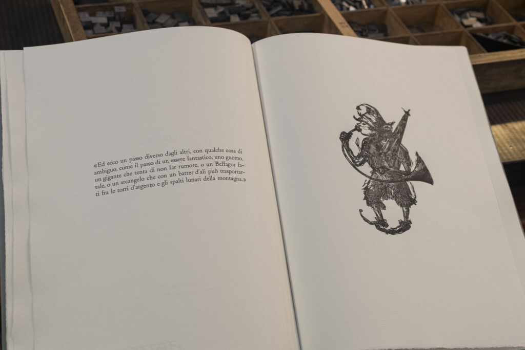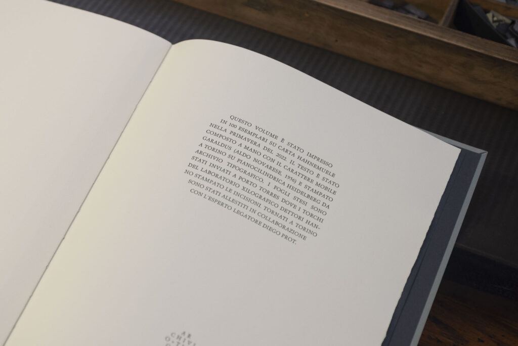 Libro composto e stampato in collaborazione con il laboratorio di stampa xilografica di Giovanni Dettori. Le fasi di progettazione, composizione, stampa dei testi, legatoria e confezione sono state realizzate da Archivio Tipografico. La stampa delle xilografie è stata realizzata dal Laboratorio Xilografico Dettori.