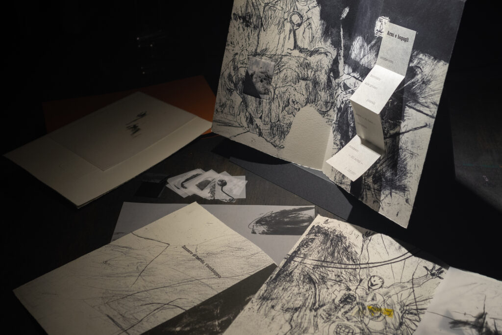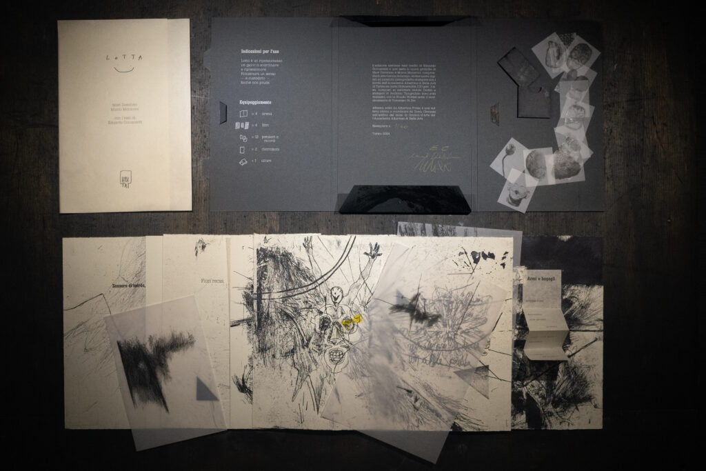 Rappresenta un intreccio di possibilità, linee, immagini e parole, un oggetto che richiede maggiore contatto e coinvolgimento rispetto al canonico libro. Fornendo “arene” e altri elementi mobili, la persona che interagisce con questo progetto dovrà “lottare” per trovare la sua forma e il suo senso: un gioco a comporre la propria lotta.