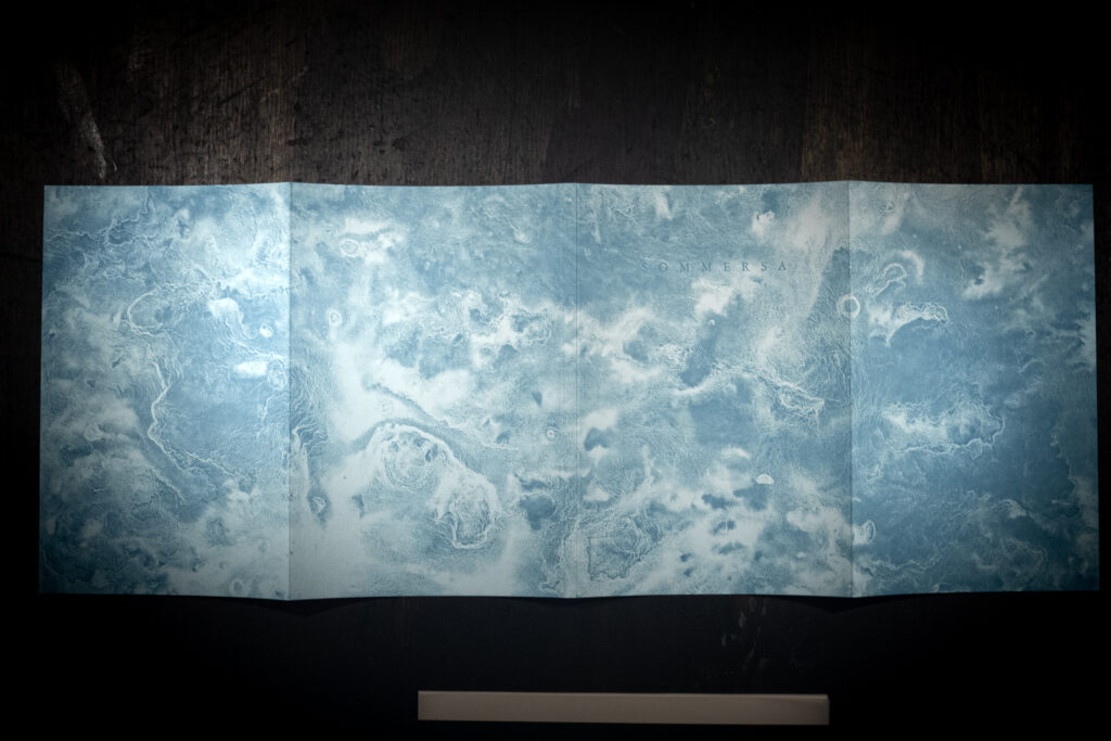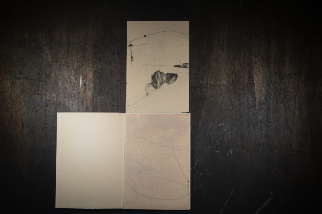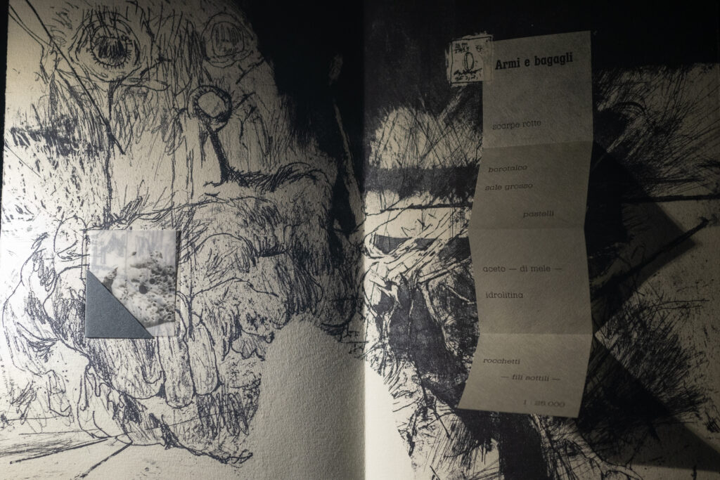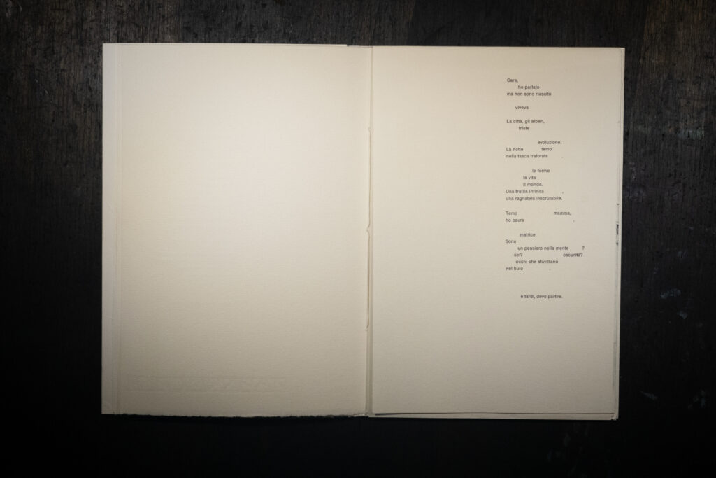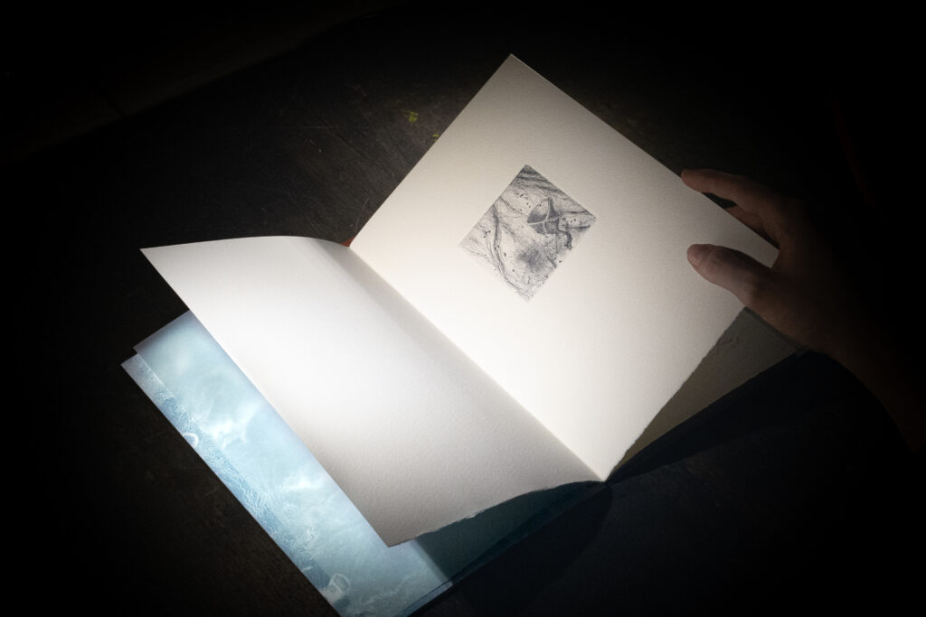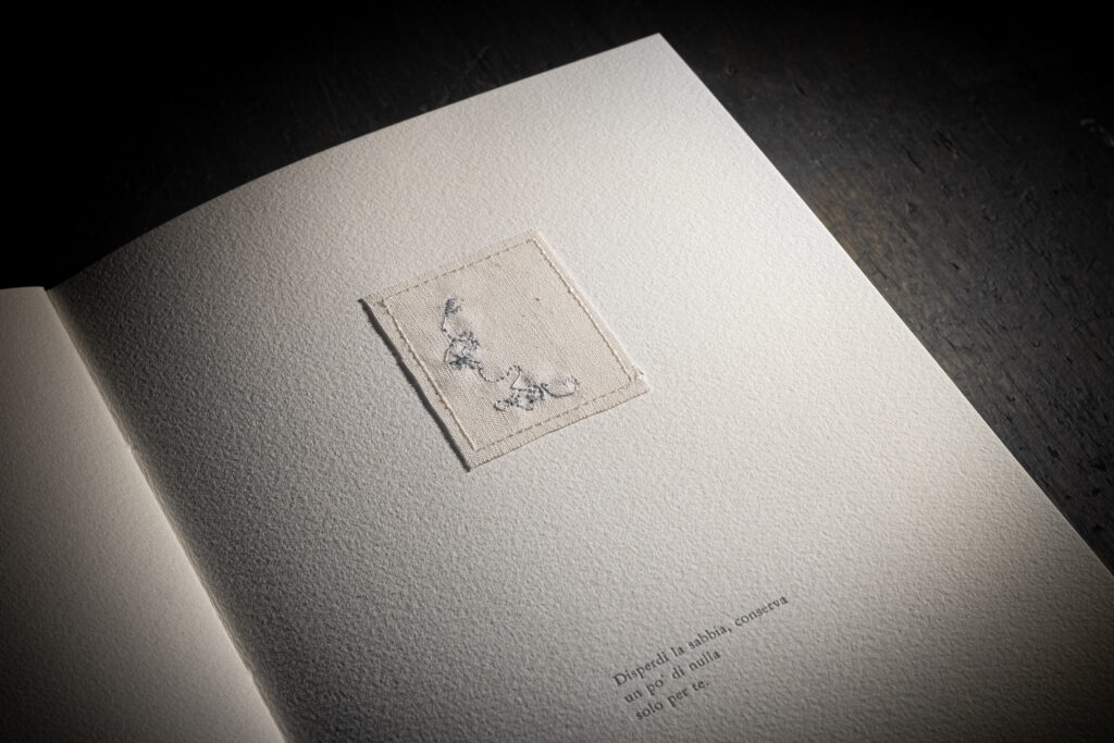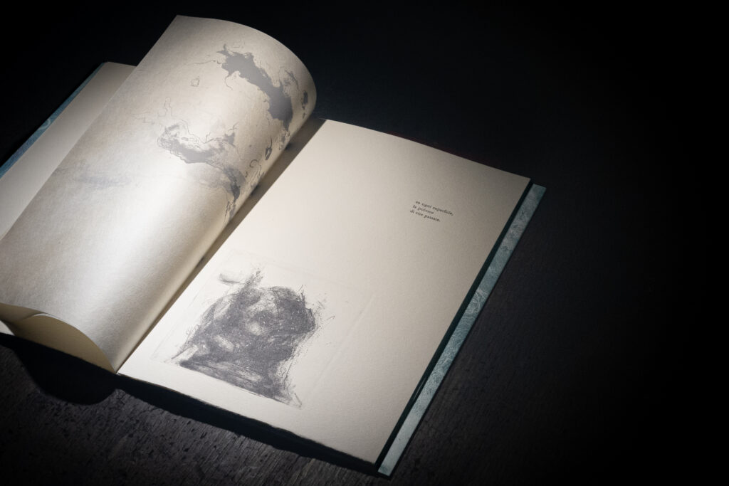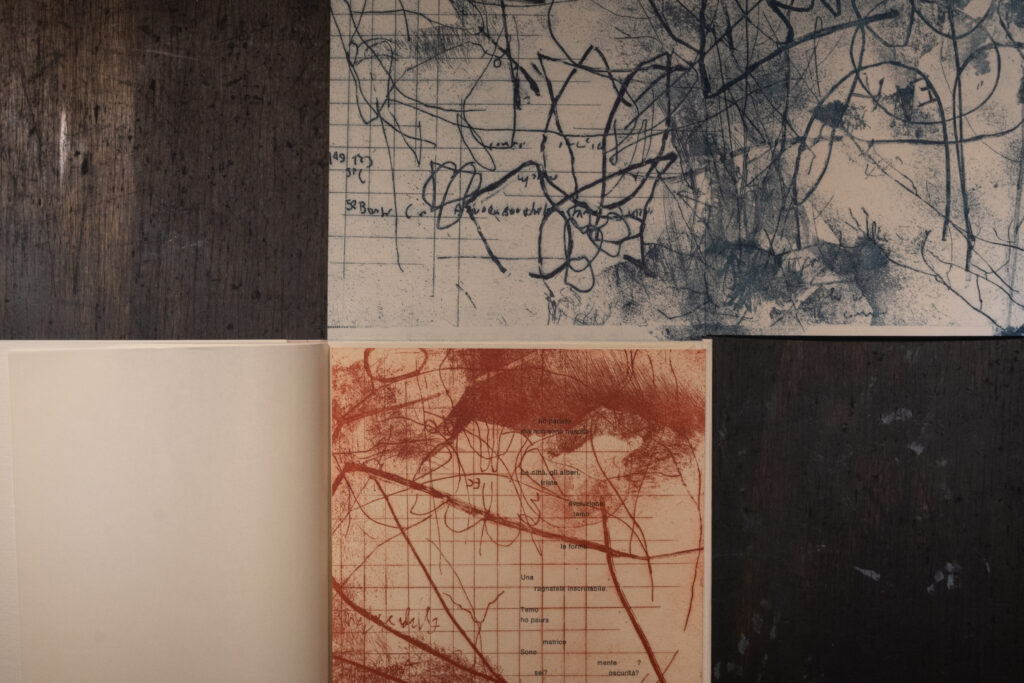 Sommersa è un libro d’artista in cui entrare a piedi nudi. Come un flusso, i segni, le incisioni,le parole, si mostreranno in trasparenza dietro alle loro stratificazioni. Anche ciò che è stato cancellato tornerà, forse, in altre forme.