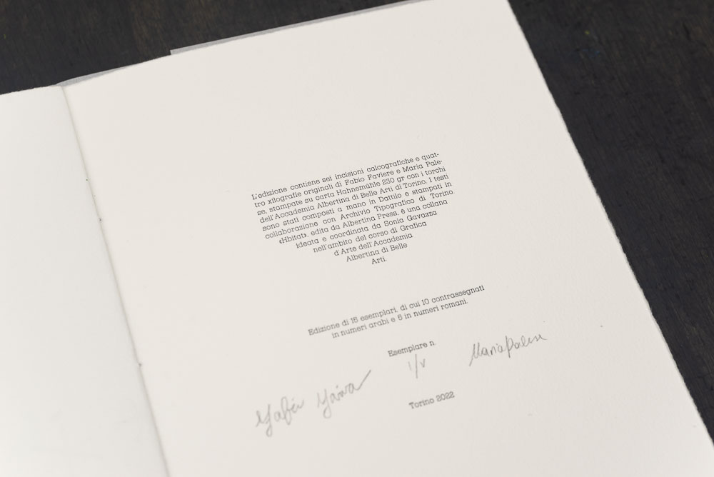 Consiste in una collana di libri d’arte progettati e stampati da persone che hanno frequentato il corso di Grafica d’Arte sotto la supervisione di Sonia Gavazza. Alla stampa artistica realizzata in Accademia viene affiancata la fase di progettazione e stampa dei testi in caratteri mobili, nonché la legatura e l’allestimento, in Archivio Tipografico.