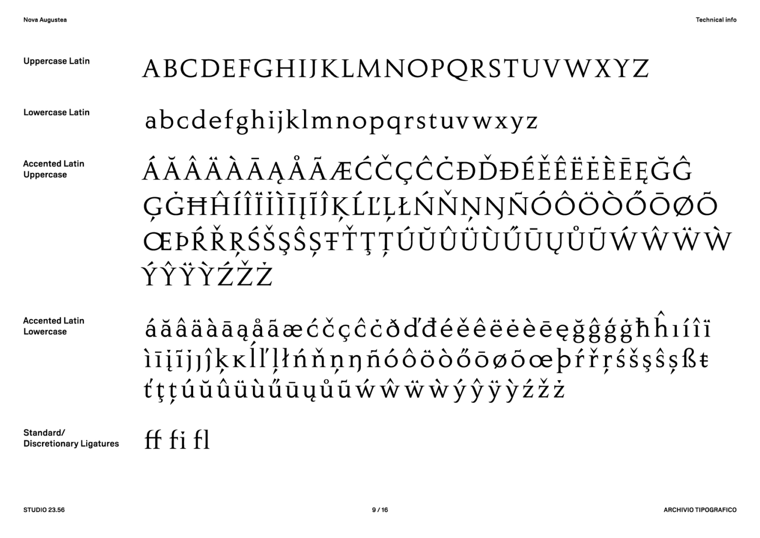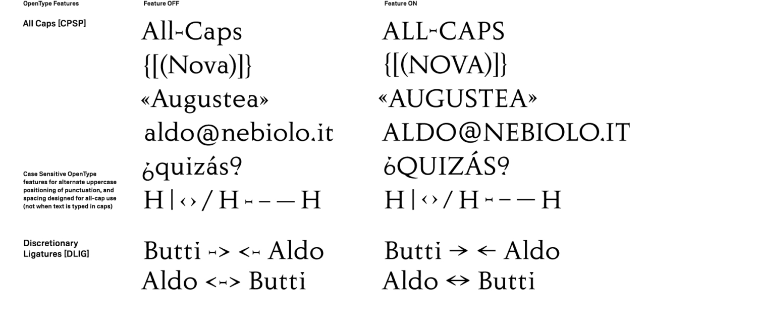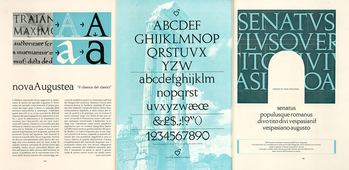 Nova Augustea è la digitalizzazione dell’omonimo carattere pubblicato da Nebiolo nel 1964 e firmato da Aldo Novarese, a sua volta basato sul carattere Augustea, disegnato dal suo maestro Alessandro Butti come reinterpretazione dei modelli delle capitali romane dell’epoca dell’imperatore Augusto. La storia racconta che Butti disegnò anche un alfabeto minuscolo ma rimase sempre riluttante a pubblicarlo, poiché trovava quasi irrispettoso proporre una simile interpretazione di un modello storico.