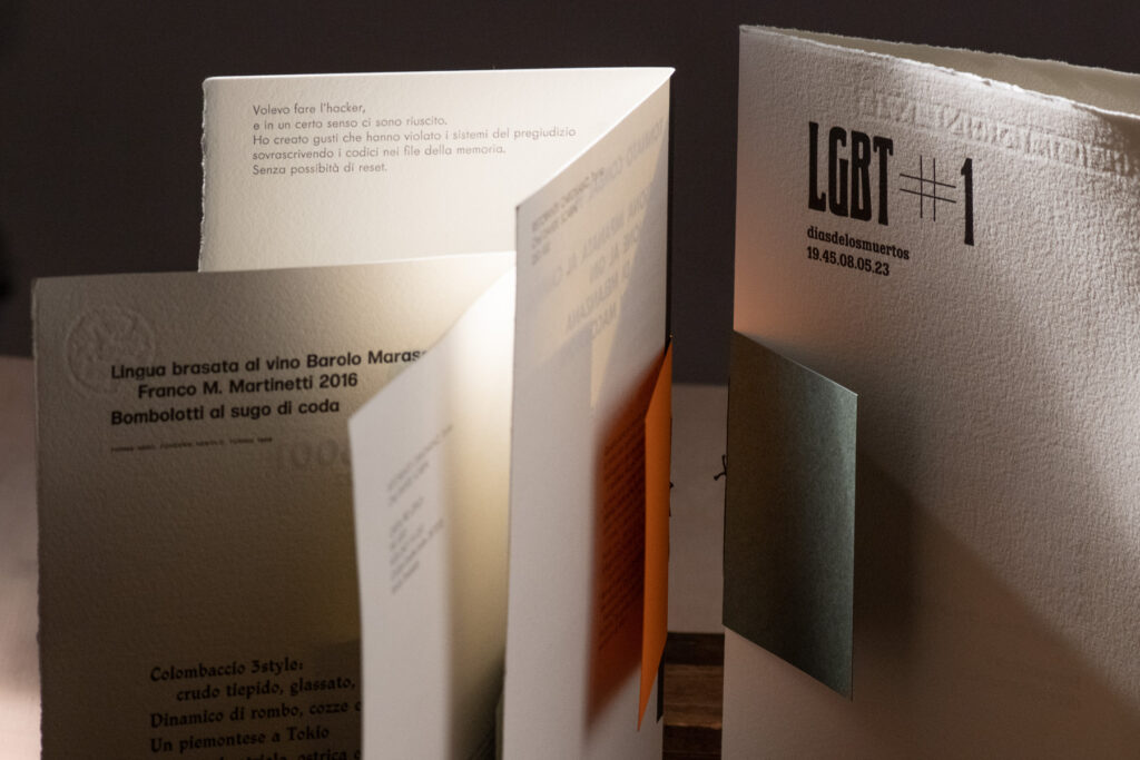 Riprendendo gli elementi visivi da un mondo che solitamente appartiene al mondo della stampa d’arte vengono realizzati dei menu in tiratura limitata e numerata per accompagnare chi vive l’esperienza della degustazione di una cena stellata che dura tutta la sera.