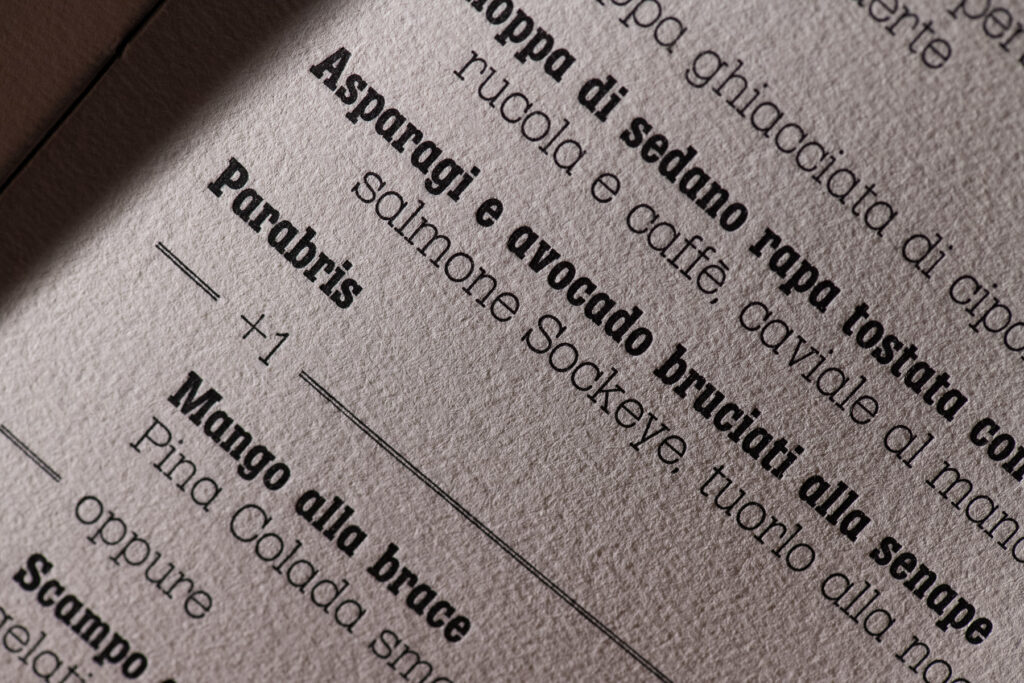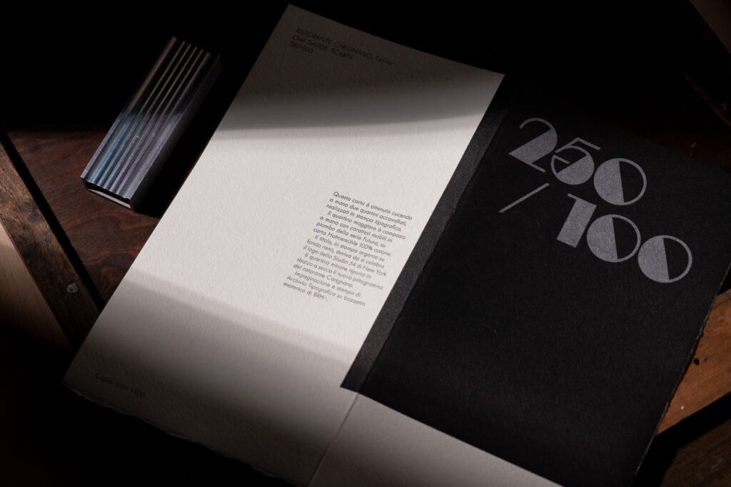 Dal 2024 Archivio Tipografico si occupa della realizzazione dei menu dello Chef Scabin per Ristorante Carignano, sotto la direzione artistica di BRH+.