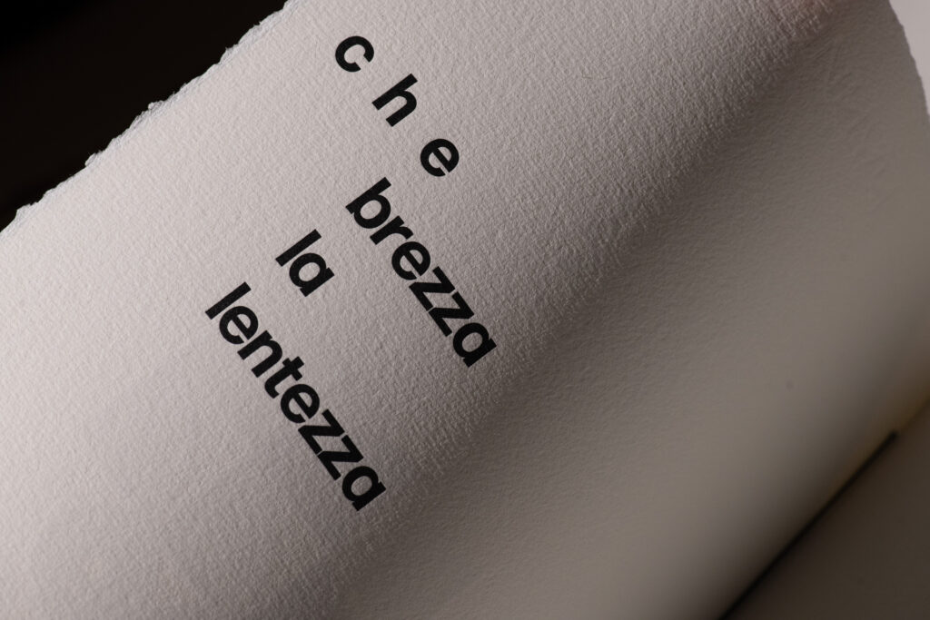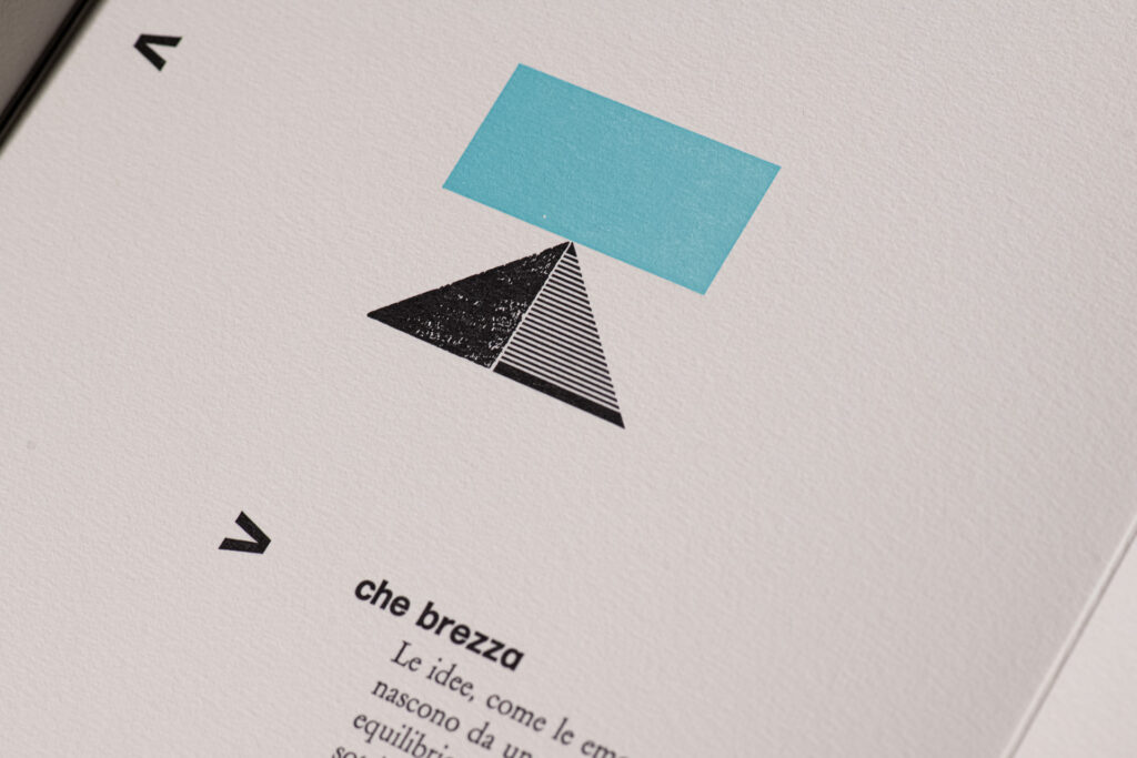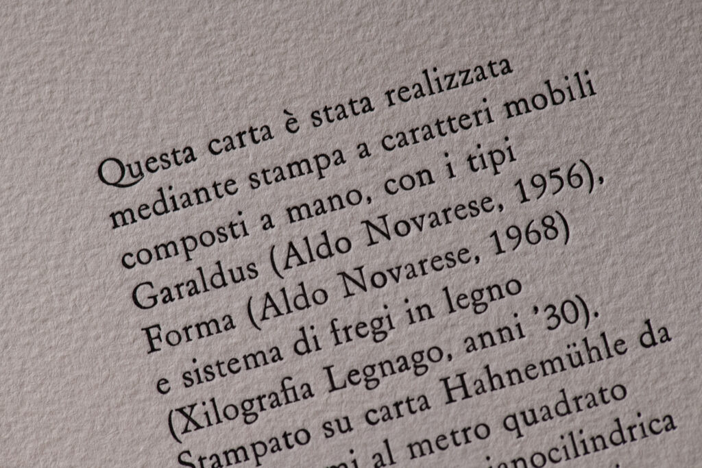 Questa serie di menu è interamente composta a mano con caratteri mobili in piombo o legno, su carta di puro cotone e con sbalzo a secco che riproduce l’uovo che si schiude, elemento simbolico di Matteo Baronetto.