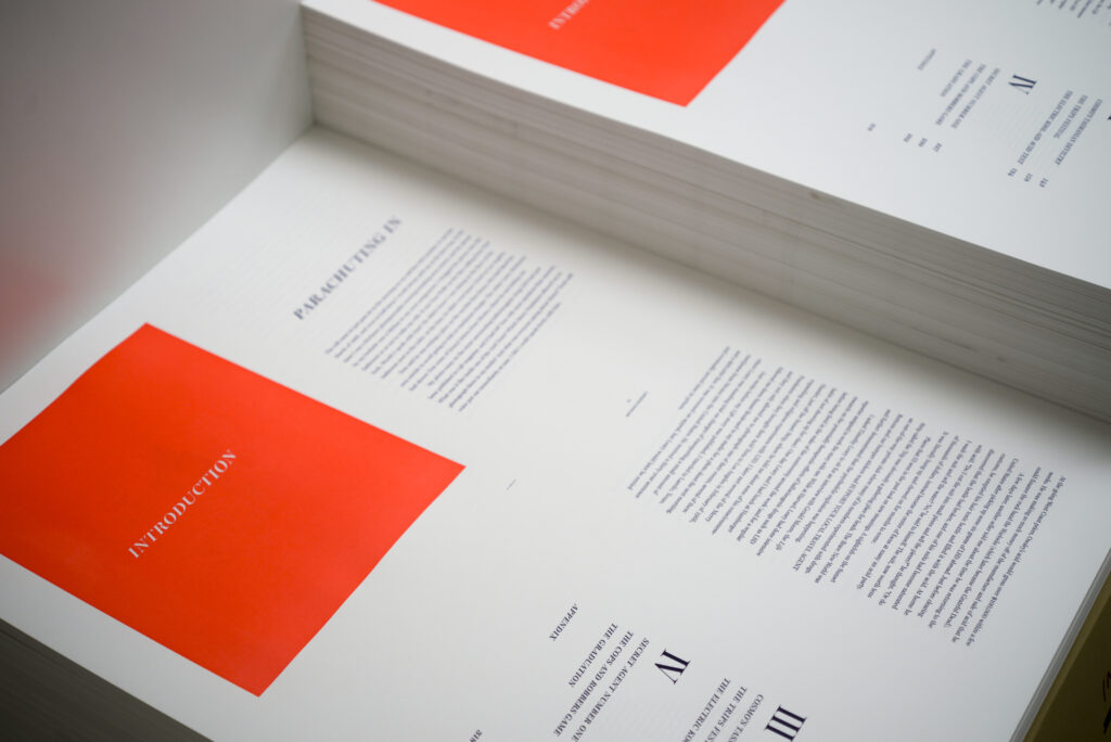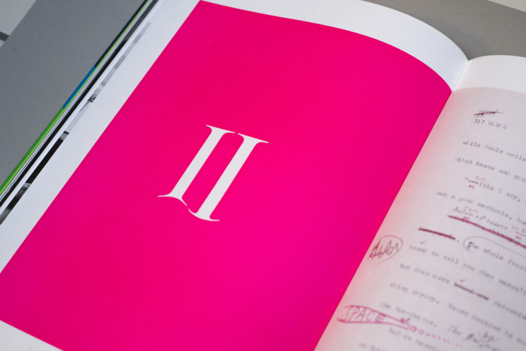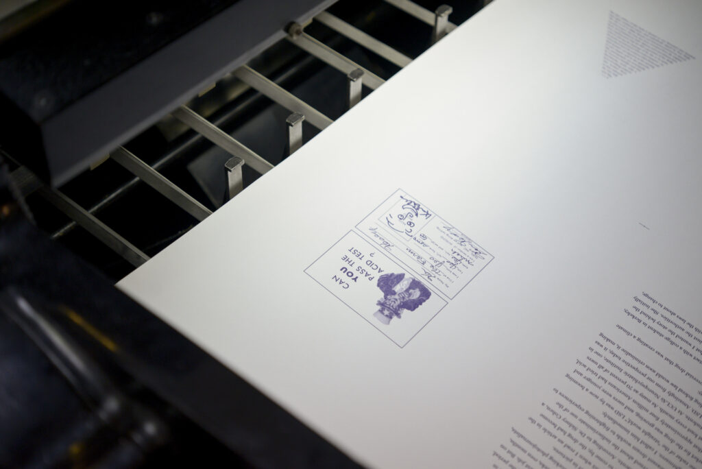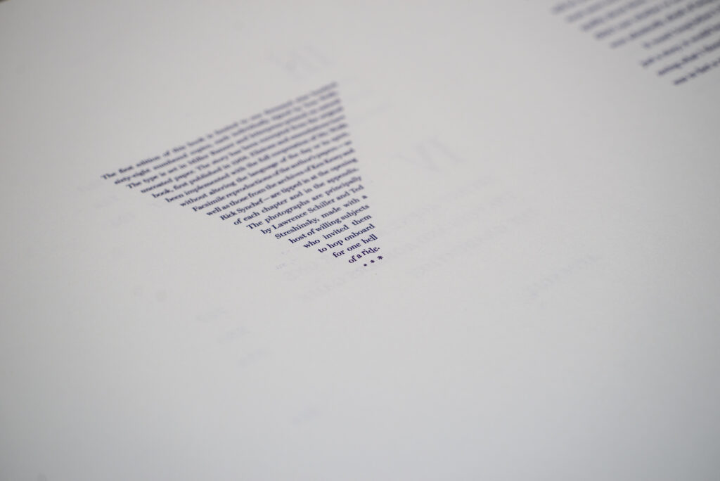 Archivio Tipografico si è occupato di stampare tutta la sezione testuale e gli elementi tipografici, compresi frontespizio, aperture dei capitoli e colophon. Interamente stampato su pianocilindrica Heidelberg OHZ con cliché fotopolimerici.