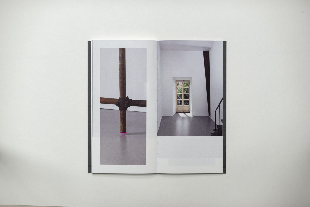 La logica del layout della sezione centrale divide la pagina in due metà. La metà superiore è dedicata alle fotografie delle opere nel contesto della galleria, la metà inferiore è dedicata al testo. Nelle pagine in cui sono presenti sia testo che immagini c’è una relazione diretta tra le uno e l’altra. Questa impostazione editoriale rende possibile una lettura agevole di testo le immagini anche in un formato ridotto, evitando didascalie o rimandi di pagina. Oltre a ciò rende possibile l’edizione in due lingue senza alcun adattamento del layout: il testo italiano, stampato in nero, viene sostituito con il suo equivalente in lingua inglese.