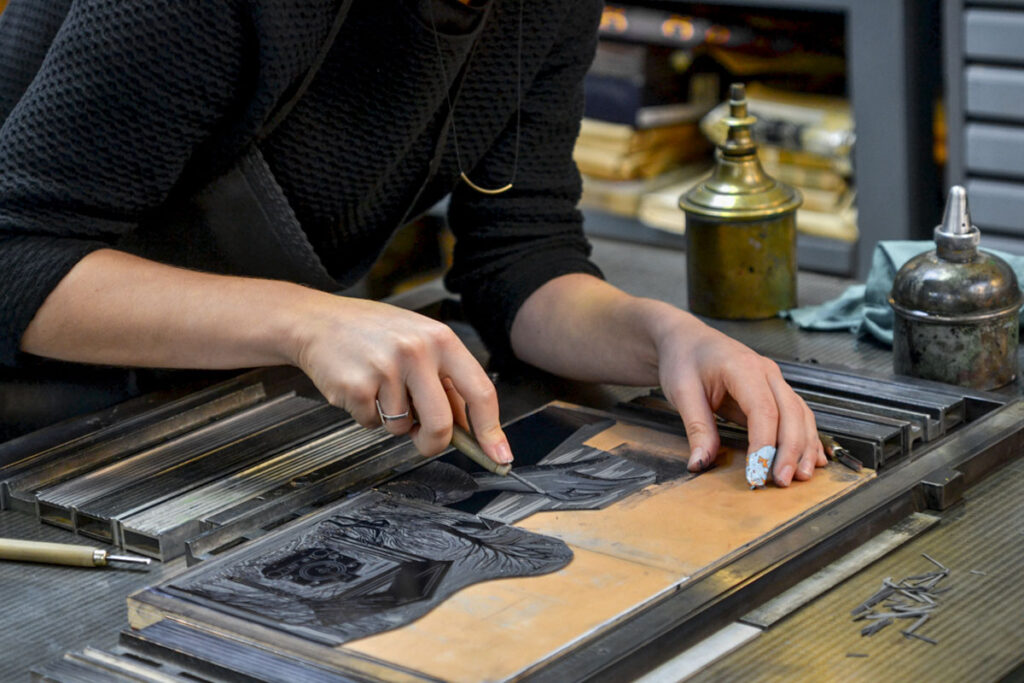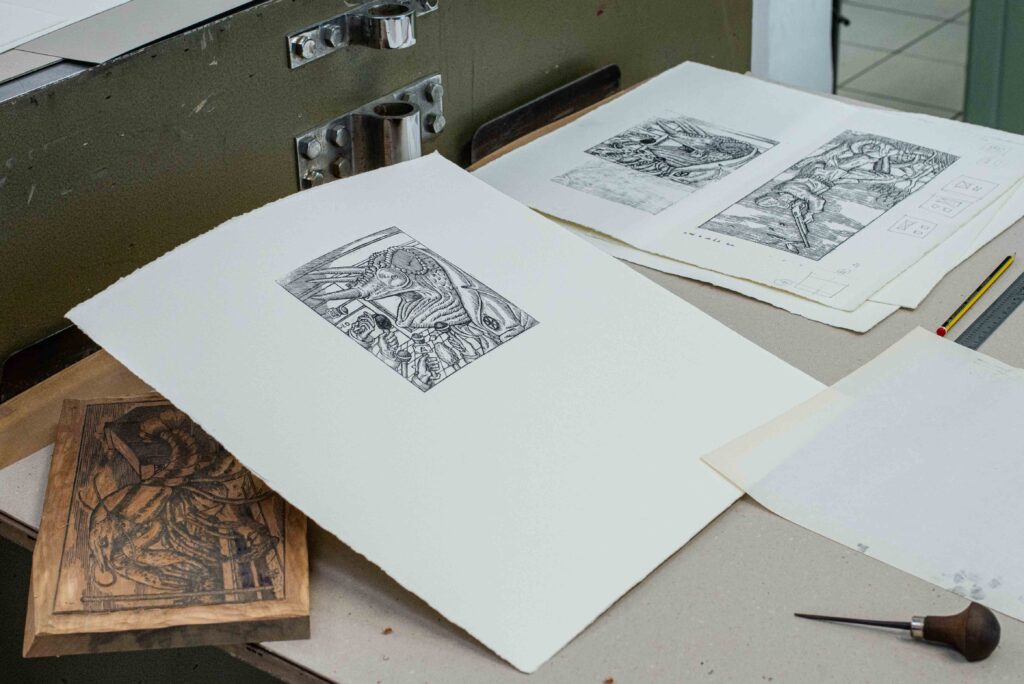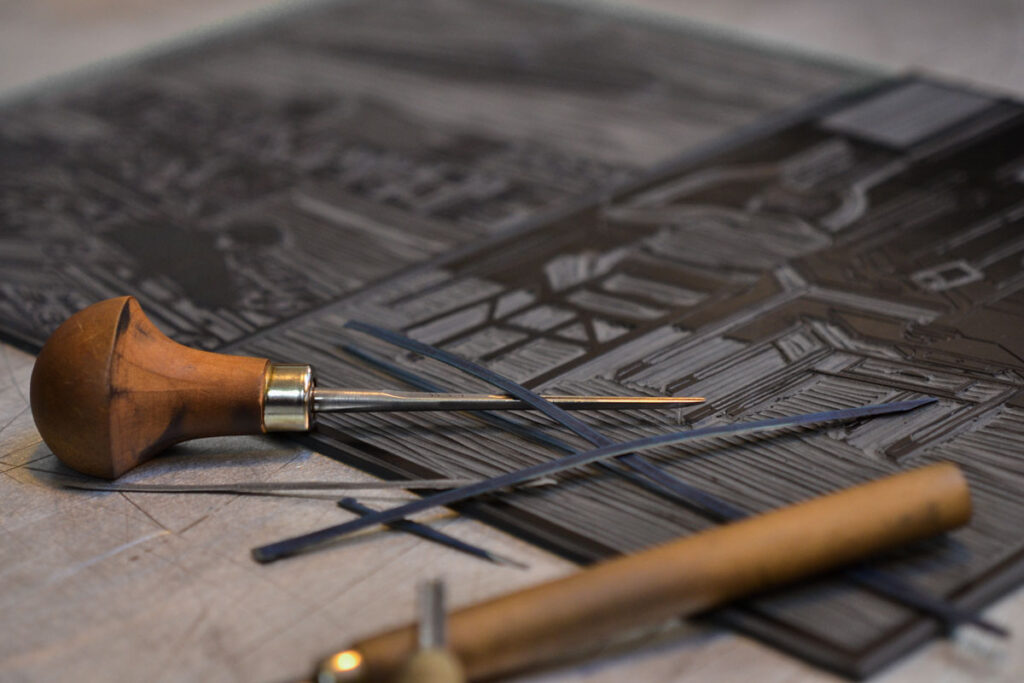 Lo stampa rilievografica consente anche l’utilizzo di matrici incise a mano quali xilografie, incisioni su linoleum o materiali similari. È possibile sperimentare con i diversi materiali per ottenere campiture, dettagli ed effetti visivi differenti.
