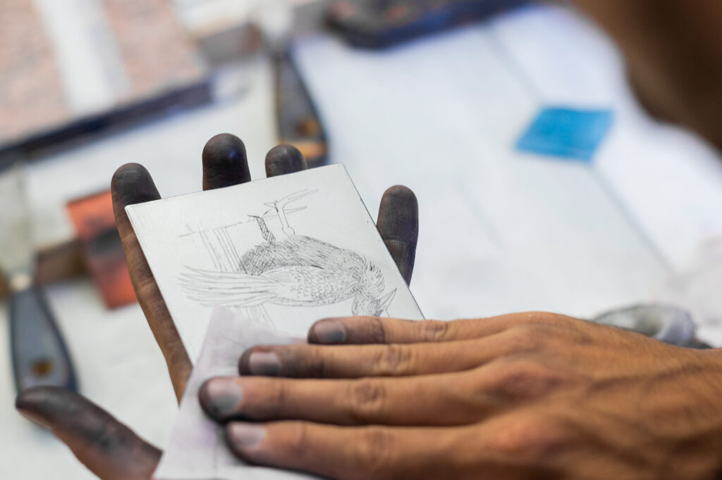 In aggiunta alla rilievografia il laboratorio si avvale della collaborazione con lo studio di Sonia Gavazza per produrre stampati in calcografia, ampliando ulteriormente le possibilità artistiche, espressive e tecniche.